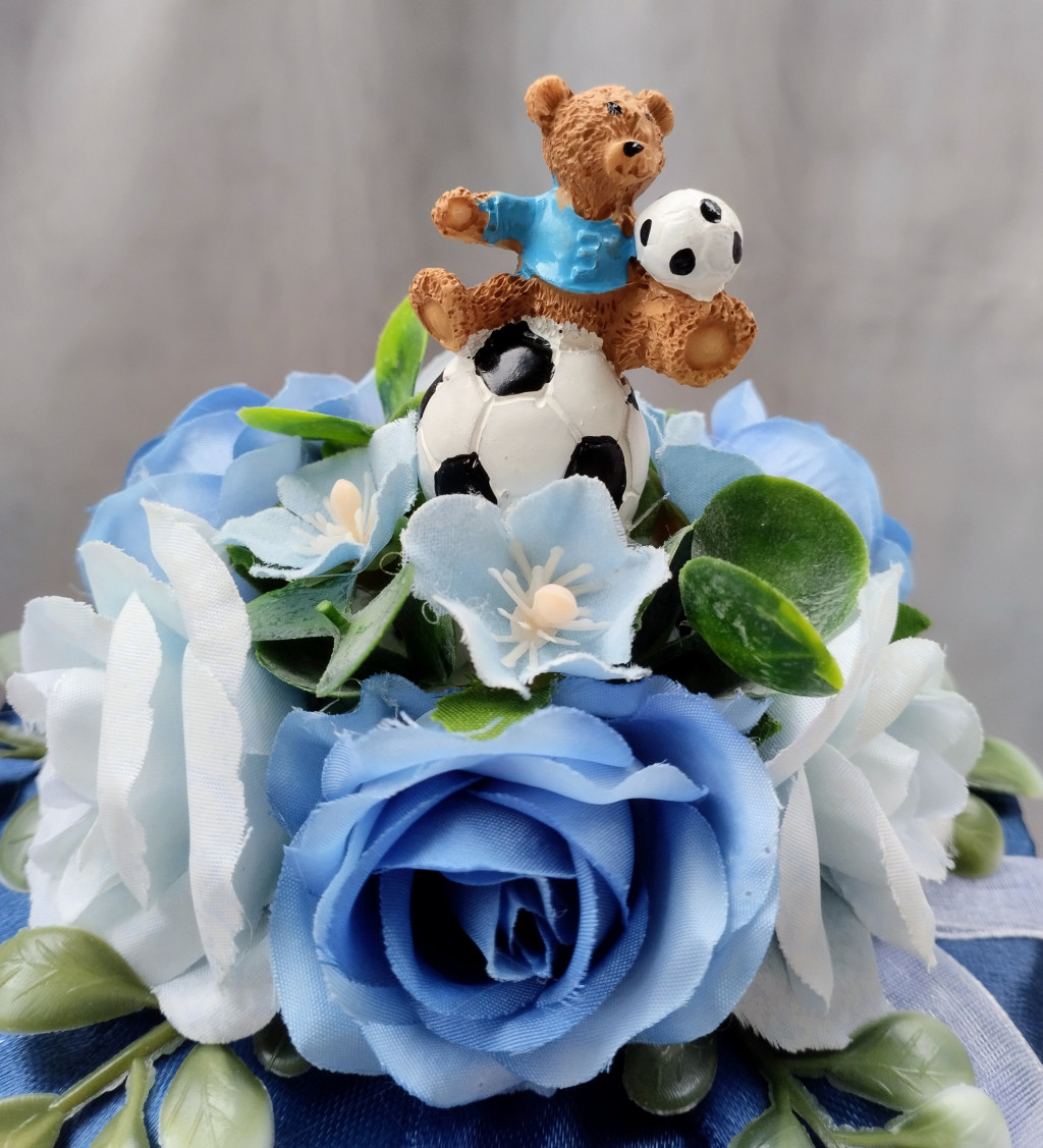 Fiús ovis ballagási csokor aranyos focis macival, kék virágokkal, zöldekkel díszítve. Tökéletes választás kis focirajongóknak ballagásra, ha egy igazán különleges és maradandó ajándékot keresel.
